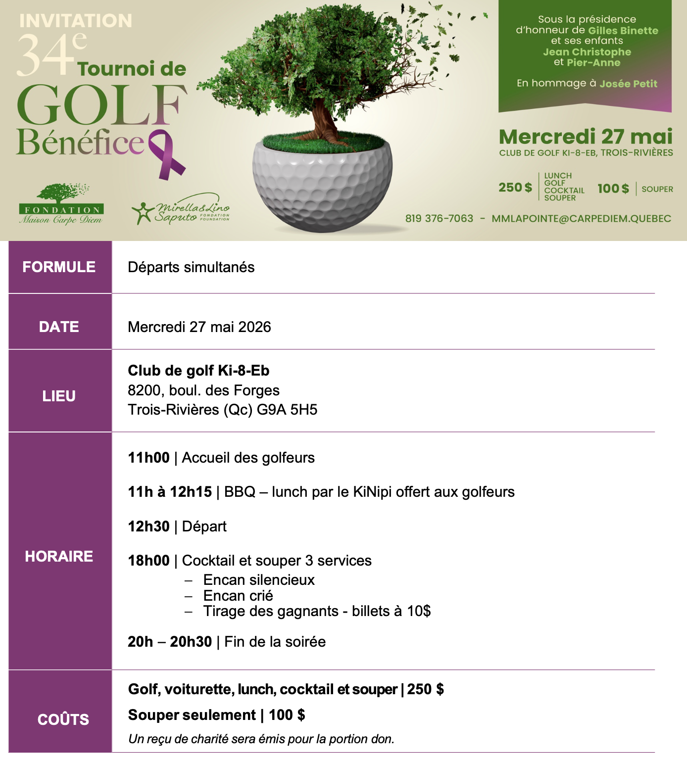 Nous sommes heureux de vous convier au 34e tournoi de golf de la Fondation Maison Carpe Diem, qui se tiendra le mercredi 27 mai 2026 au Club de golf Ki-8-Eb, à Trois-Rivières.